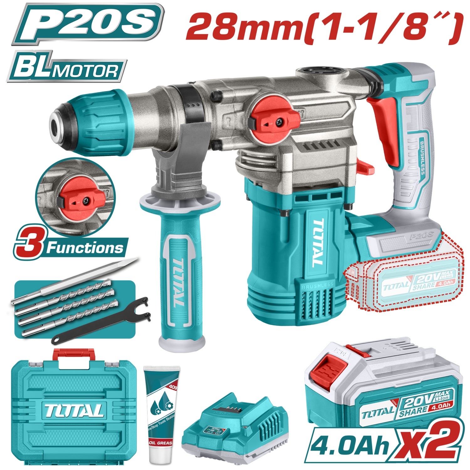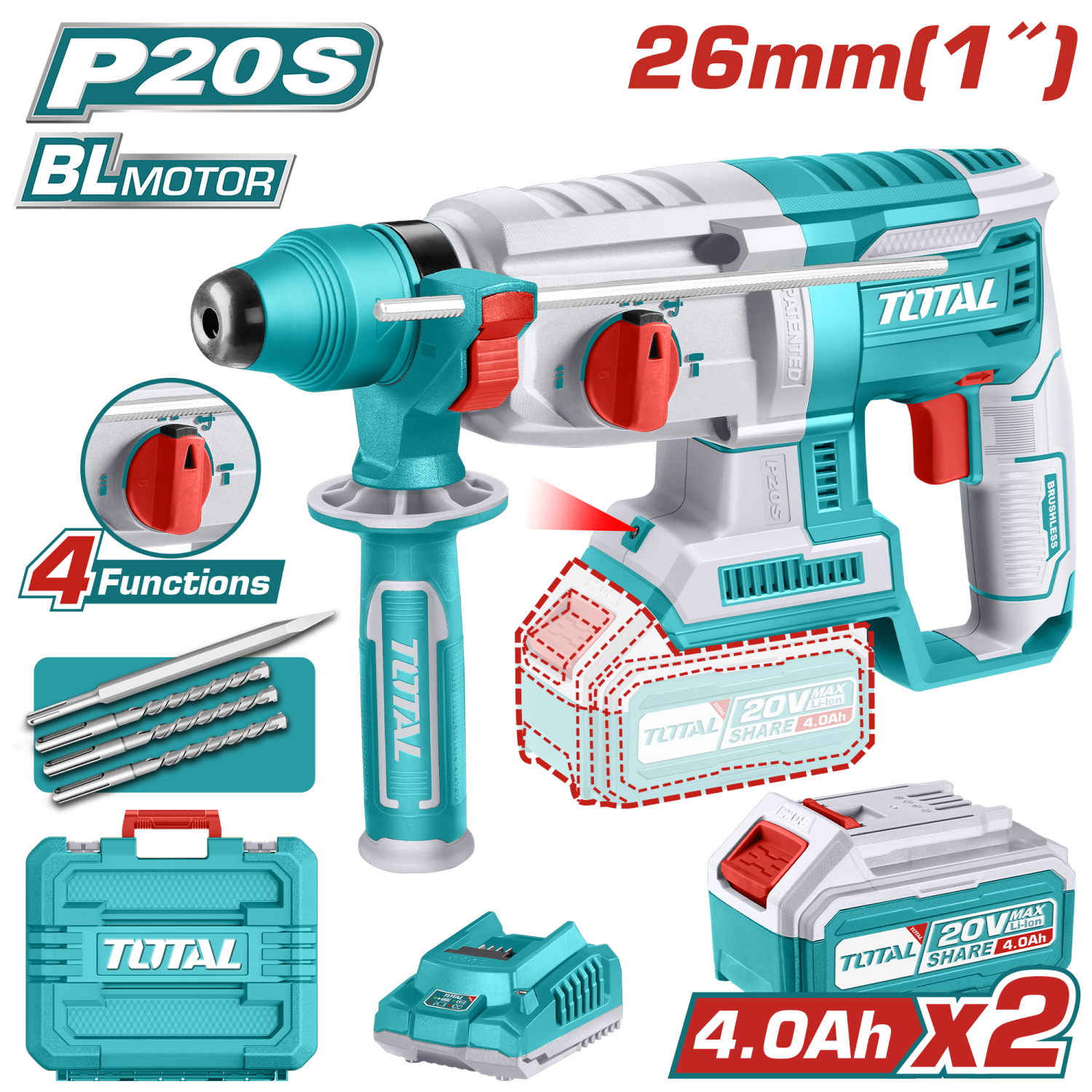 ROTOMARTILLO INALAMBRICO 20V 2.5J SDS PLUS TOTAL 2 BAT 4AH