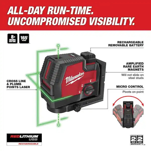 Nuestro láser verde recargable por USB para líneas transversales y puntos de plomada está alimentado por REDLITHIUM™ USB, lo que ofrece un tiempo de funcionamiento de todo el día y una visibilidad sin concesiones. Los rayos láser de alta intensidad le permiten ver los rayos verdes, las líneas y los puntos de plomada hasta 100' para una nivelación y alineación rápidas y precisas. El soporte magnético integrado cuenta con un control de microajuste que pivota sobre el punto, lo que le permite una configuración más rápida y una alineación punto a punto a largas distancias. Este láser de líneas cruzadas con puntos de plomada cuenta con imanes de tierras raras amplificados que proporcionan una fuerte sujeción en superficies metálicas con agujeros para colgar tornillos y clavos integrados que hacen que la configuración sea fácil y eficiente en cualquier entorno. Puede cargar la Batería USB REDLITHIUM™ dentro del láser a través de Micro USB o intercambiarla con Baterías USB REDLITHIUM™ adicionales para prácticamente no tener tiempo de inactividad. El láser verde recargable MILWAUKEE® de líneas cruzadas y puntos de plomada es ideal para cualquier profesional y está cubierto por una garantía de dos años