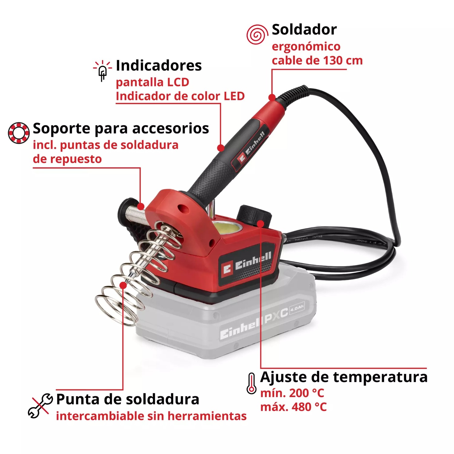 La estación de soldadura inalámbrica Einhell incluye 2 puntas puntiagudas, 1 plana, soldadura (1,0 mm) y una esponja de limpieza.