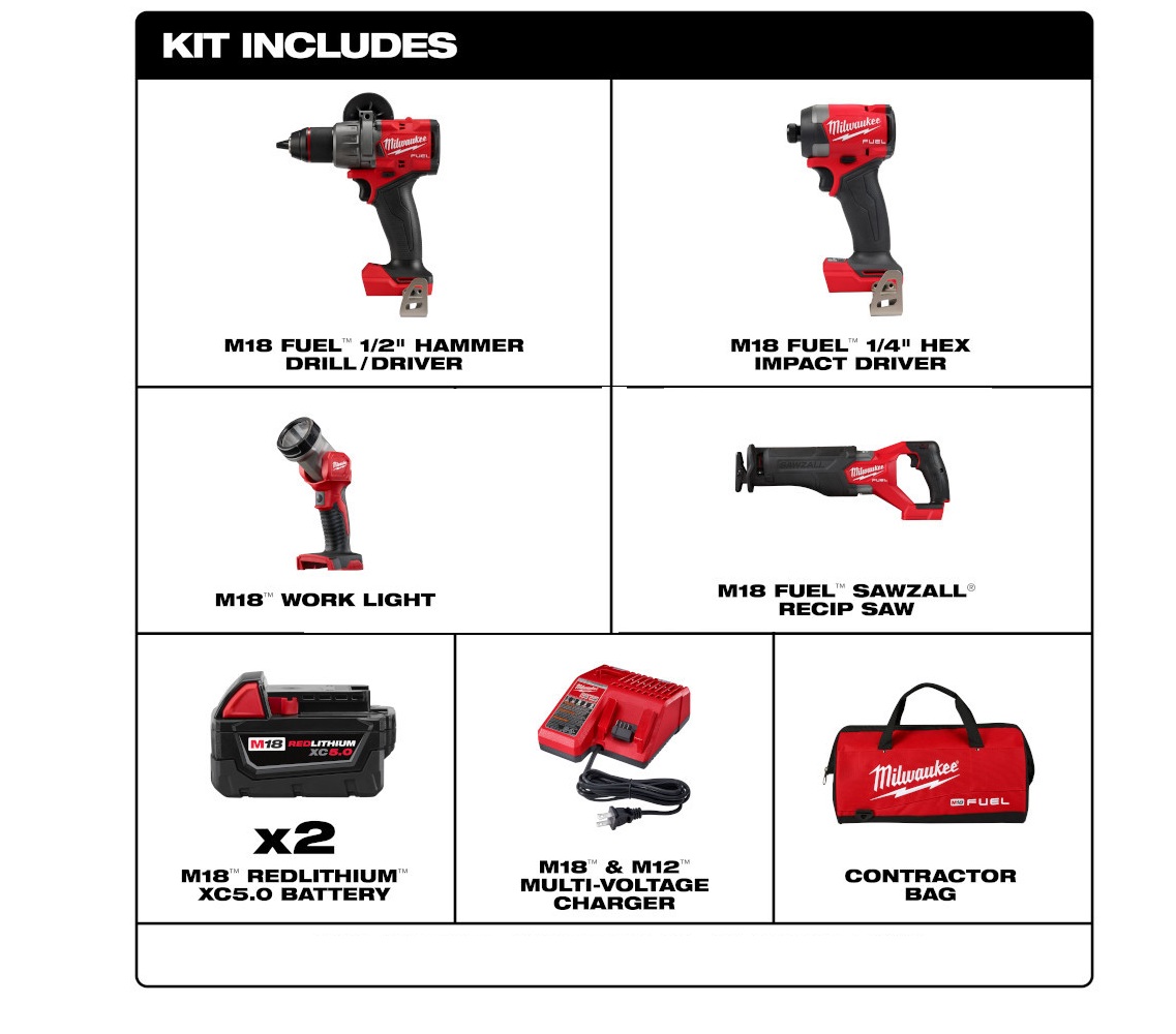 El kit combinado de 4 herramientas Milwaukee M18 FUEL ofrece a los usuarios la tecnología inalámbrica de perforación, sujeción y corte de 18 voltios más avanzada de la industria. Este kit combinado de 4 herramientas de Milwaukee cuenta con cinco herramientas inalámbricas sin escobillas de iones de litio de 18 voltios M18 FUEL, que incluyen un taladro percutor de 1/2 pulg., un destornillador de impacto de 1/4 pulg., una sierra recíproca SAWZALL y Luz de trabajo LED. M18 FUEL es totalmente compatible con el sistema inalámbrico Milwaukee M18 de 18 voltios, con más de 250 soluciones. M18 FUEL presenta la tecnología inalámbrica más avanzada de la industria, un motor sin escobillas POWERSTATE, inteligencia REDLINK PLUS y tecnología de batería REDLITHIUM, lo que resulta en una vida útil más prolongada del motor, mayor tiempo de funcionamiento y más potencia.