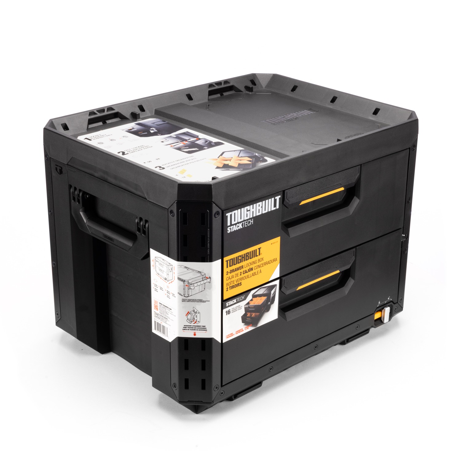 La caja de herramientas con cierre ToughBuilt® StackTech® de 2 cajones divide la organización de herramientas en dos cajones con cierre independiente, lo que ofrece un acceso protegido y un almacenamiento de alta resistencia sin sacrificar la capacidad de apilamiento ni la robustez.