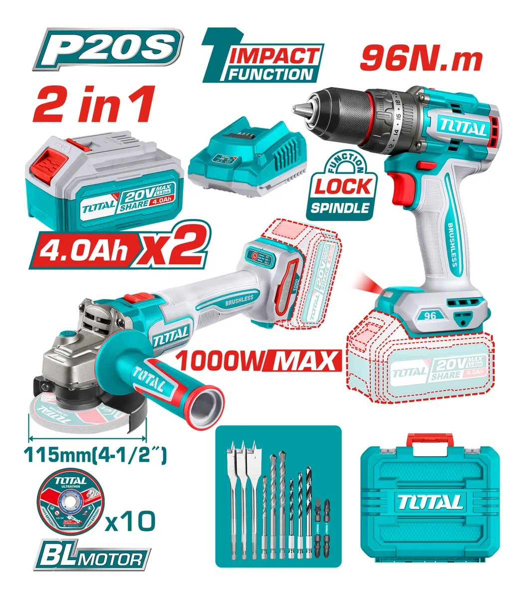 KIT TALADRO PERCUTOR 96NM Y ESMERIL 4 1/2 2 BAT Y CARG TOTAL